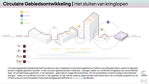 Om een circulair gebouwde omgeving te realiseren, moeten kringlopen op zowel gebouw- als gebiedsniveau worden gesloten.  Het is belangrijk om circulaire principes ook op stedenbouwkundige schaal toe te passen. Een integrale aanpak helpt om overlappende ambities beter te stroomlijnen en maakt duurzame gebiedsontwikkeling haalbaarder en effectiever.