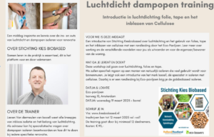 Tijdens deze training van kiesbiobased .nl in samenwerking met Cirkelstad krijgt u een introductie in luchtdichting met folie en tape en het inblazen van cellulose.