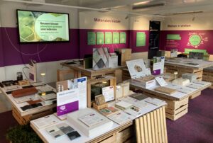 De BijBabbelbox bestaat uit verschillende bouwketen, omgebouwd tot ‘kennisdelingsruimte’. Hier vind je onder andere een met zorg samengesteld informatie- en innovatie-eiland met (tastbare) circulaire productalternatieven. Van cellulose- en hennepisolatie, tot CO2-arme keramiek, buitengevelbekleding van mos, olifantsgras en M.C. Escher geïnspireerde parkeertegels. Cirkelstad-spinner Wytze Kuijper: “We staan als Nederland voor een enorme opgave, wat betreft bouwen, renoveren en verduurzamen. En dat terwijl alle grondstoffen die we dit jaar mogen gebruiken al op 5 mei op waren. Maar hebben we op die datum het werk neergelegd? We doen net alsof onze neus bloedt. Brussel is intussen al het een en ander aan het voorkoken, en dat wordt behoorlijk spannend. Er wordt gekeken wat Nederland straks mag gebruiken in de vorm van een CO2-budget. Dat duurt misschien nog even, maar dát er iets komt, is zeker. Als we niets doen, of te weinig, dreigt de CO2 lockdown. Hoe belemmerend dat is, hoef ik niemand te vertellen.”