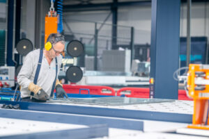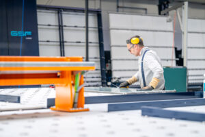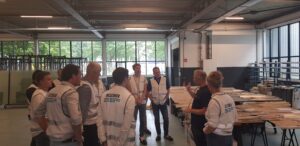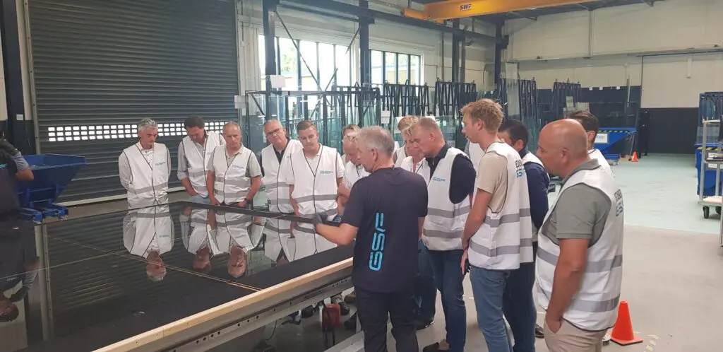 GSF is een fabrikant die van oud dubbel glas, weer nieuw dubbel glas maakt. Het oude glas (dat wordt goedgekeurd door de tests van GSF) gaat dus niet meer een maakproces in waarbij glas wordt omgesmolten. Dat bespaart enorm veel CO2 uitstoot. Maarten Rood en Harm-Jan Horring van GSF lieten ons het maakproces zien maar ook wat daar allemaal logistiek bij komt kijken. Een fabriek zet je niet zomaar neer en het was indrukwekkend om te zien wat voor een ontwikkeling GSF door de jaren heen heeft meegemaakt. En de noodzaak voor dergelijke producten is hoog. Maarten vertelde dat de natuurlijke grondstof voor glas, zilverzand, aan het opraken is. Bovendien voelen we hier de geopolitieke spanning letterlijk aangezien Rusland en Oekraïne zeer belangrijke leveranciers waren van zilverzand. Daarom gaan we deze grondstof van verder weg halen wat nog meer uitstoot geeft in de logistiek en ook nog eens prijsopdrijvend werkt. Vanuit oud dubbel glas nieuw dubbel glas maken is dus in meerdere opzichten een geweldige optie.