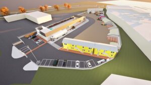 Een 3D tekening van de circulaire grondstoffenhub met geparkeerde auto’s, een vrachtwagen en bouwmachines, en een weg met daarlangs verschillende vakken met gebruikte bouwmaterialen. Hier staan bouwmachines bij. Er staan ook bouwcontainers voor medewerkers op het terrein.