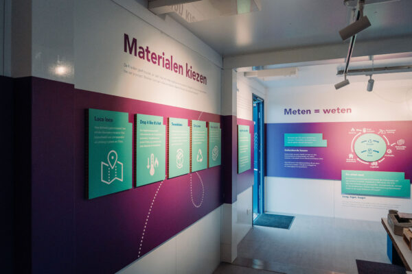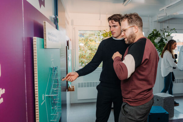 De BijBabbelbox is een circulaire pop-up expositieruimte. Hij bestaat uit samengevoegde bouwketen, waarin per sessie ongeveer 18 mensen worden ontvangen. “Hier kunnen mensen elkaar fysiek ontmoeten, bijpraten, trainingen krijgen, maar vooral ook duurzame bouwmaterialen voelen en uitproberen,” legt Lianne uit. “De inrichting is ook circulair, zo hebben we afgekeurde bouwhelmen als bloempotten en fruitkistjes als tafels. We willen laten zien wat er al mogelijk is en wat er in de toekomst nog aan gaat komen. Vaak is er op de werkvloer een bepaalde terughoudendheid naar het onbekende, zoals een compleet nieuwe materiaalsamenstelling, een hergebruikt item of biobased materialen. Door al deze smaken zelf in de box te ervaren, wordt het minder abstract, je krijgt dan zin om het in de praktijk uit te proberen.