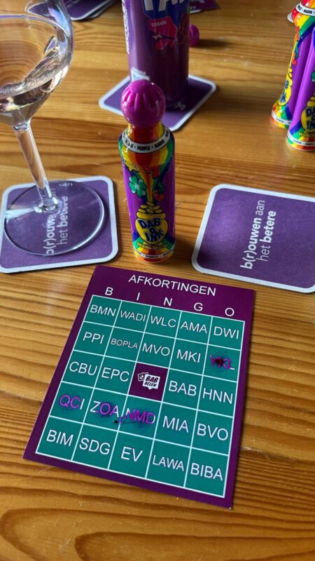 Aalberts heeft zo’n 150 medewerkers in heel diverse functies. Om iedereen mee te krijgen moet je inventief zijn. Informerend, maar vooral ook leuk en niet belerend. Lucia en Lianne hebben een scala aan middelen verzonnen. “Nee, er was geen draaiboek dat we van internet konden plukken,” lacht Lianne, “we hebben gebrainstormd en als je er zelf plezier in hebt, verzin je vanzelf hele leuke dingen. Denk aan een afkortingenbingo, een petje-op-petje-af spel, circulariekoekjes, de quiz ‘Het Geluid’, en WC-weetjes. Daarnaast lanceerden we ook video’s, variërend van een bijzonder projectbezoek tot tafelgesprekken over bouwthema’s. Net wat ieder in zijn vak nodig heeft. En natuurlijk de BijBabbelbox.”