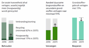 De nieuwe doelen uit het NPCE 2025 voor 2030 en 2035 lijken minder ambitieus. Ook is er geen helder onderscheid tussen niet-fossiele, gerecyclede of biobased materialen. Dit lijkt een afzwakking van de ambities en dat is het denk ik ook. Maar wat heb je aan ambities die je niet kan halen. Ook de huidige ambities om te komen tot een volledig circulaire aanpak in Nederland in 2050 roepen bij mij vraagtekens op. Ik roep op om te komen tot een beter inzicht tot welke percentages we maximaal kunnen komen, gebaseerd op hergebruik, recycling en biobased. Dan weten we gelijk in welke mate we Narrow the Loop nog meer voorop moeten zetten met vragen als hoe kunnen we meer met minder als het gaat om wonen, werken en recreëren.